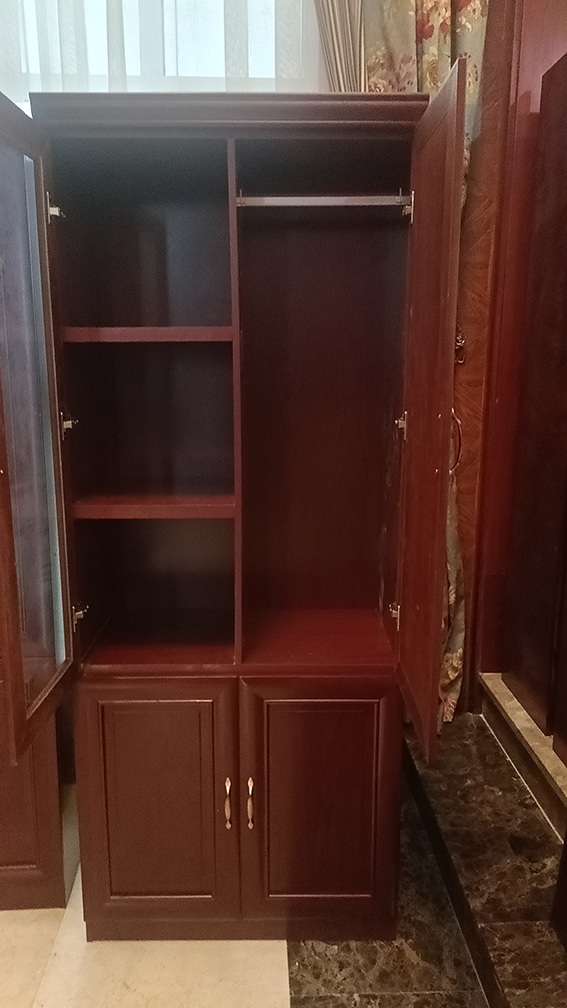 二門書柜,上下分體門結(jié)構(gòu),上書柜左邊為玻璃門,門內(nèi)有2層隔板,用于放置文件書籍等,上書柜右邊為木質(zhì)門板,內(nèi)有掛衣桿,用于放置外套等衣物。下書柜為木質(zhì)門板,內(nèi)有一層隔板。